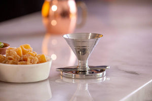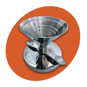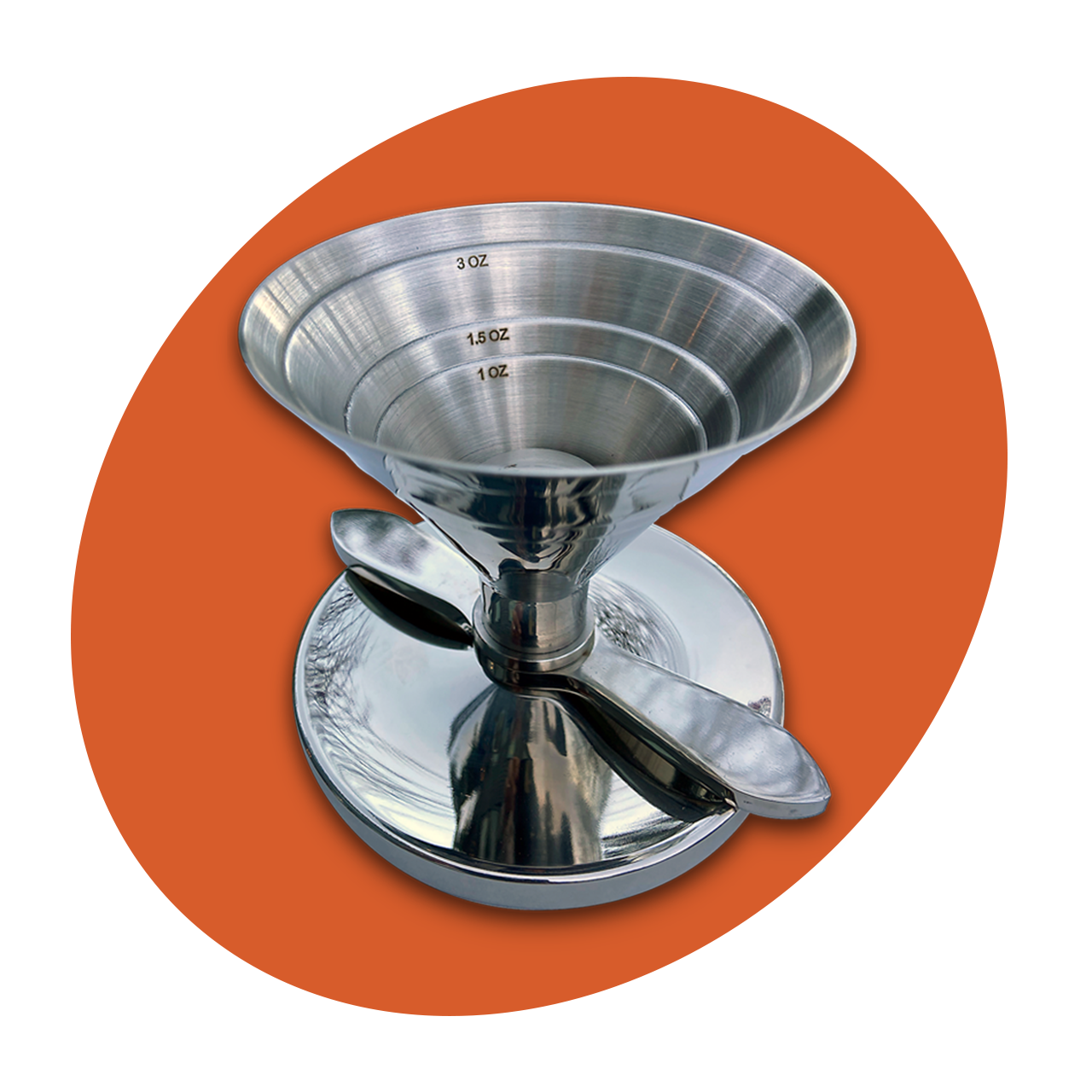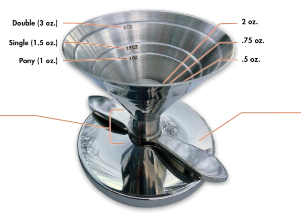 Solo Act: Een zware roestvrijstalen jigger met afgemeten trechter en gestroomlijnd schenk-/drukmechanisme. De trechter bevat 6 meetlijnen voor uw ambachtelijke cocktails. Elke jigger wordt geleverd in een goed ontworpen geschenkdoos.